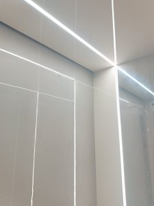 Mẫu sử dụng tông màu lạnh làm chủ đạo kết hợp hệ led thanh chạy dọc thang máy làm điểm nhấn